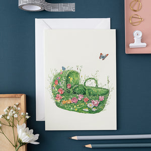 Watercolour illustration of a Moses Basket by Daniel Mackie. Printed on high quality 330gsm card. Cards are 7 x 5 inches.